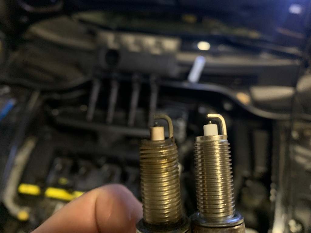 Vergleich benutzte Zündkerze (links) vs. neuer Zündkerze (rechts)